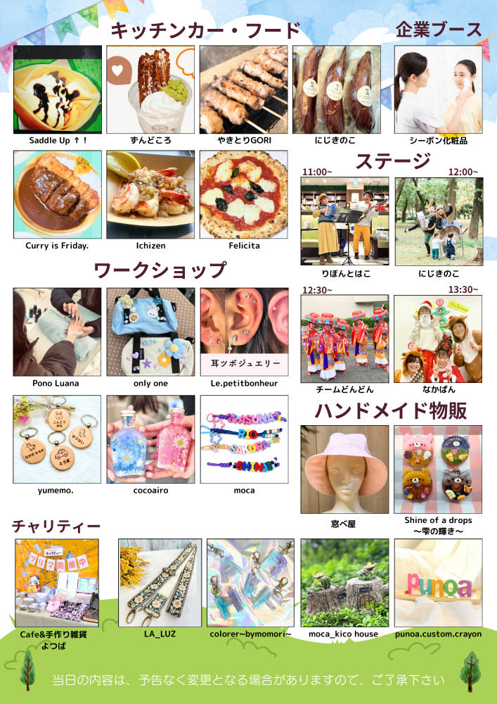 | 出店構成 | ハンドメイド物販・ワークショップ・フード☓12 企業協賛×1 フード×1 キッチンカー×6(協賛枠・・市内☓1・市外☓1) チャリティー協賛☓1 パフォーマンスステージ☓4 |